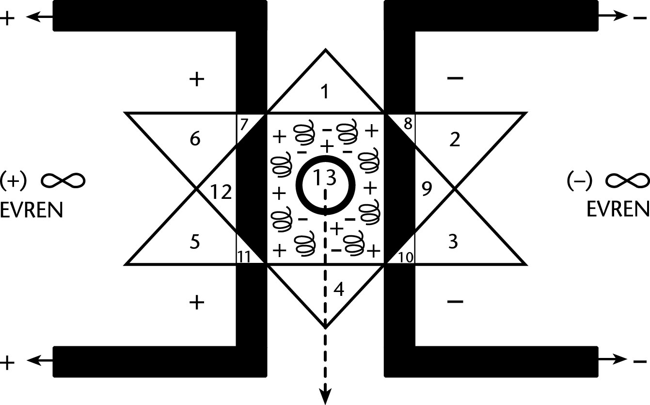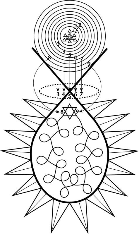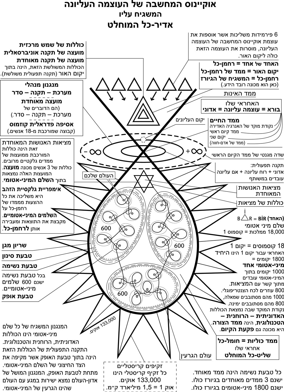 בתרשים שלעיל, שני היקומים המנוגדים, על ידי הפרדת האנרגיות של נקודת המוקד האדירה, מהווים את השלם האטומי ויוצרים את היקום האינסופי החיובי והיקום האינסופי השלילי.